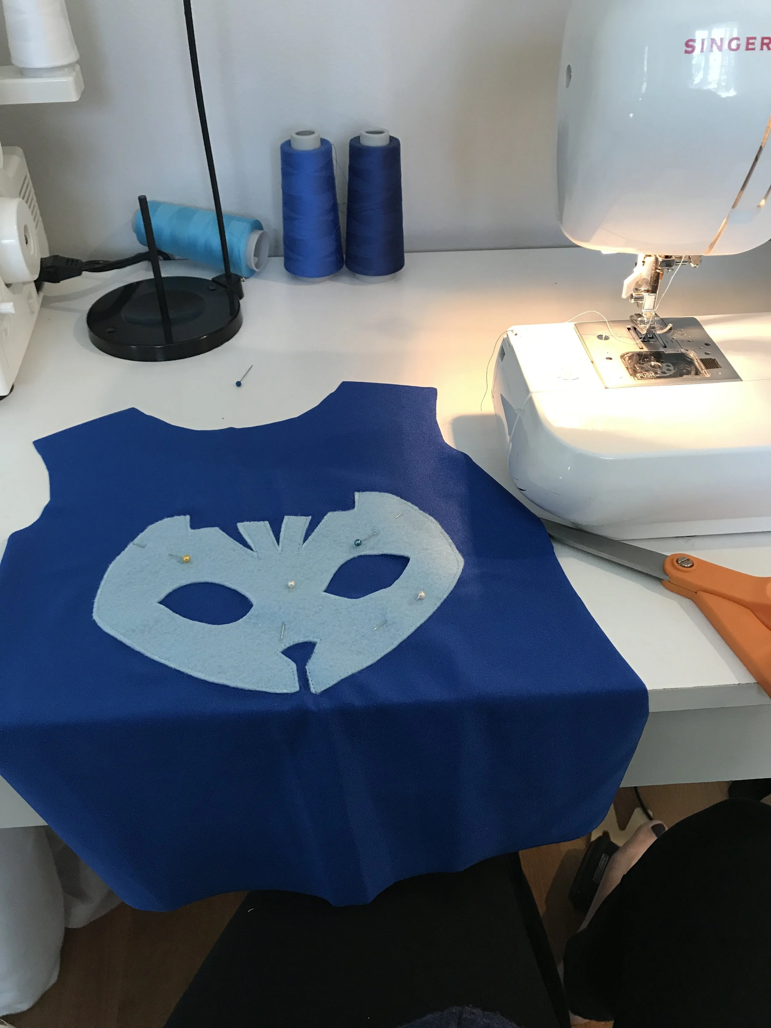 Emerson has been asking to be Catboy from PJ Masks for awhile now and although I could have paid the $30 for the one we saw at Target, I knew I could make one way cheaper. I happened to find a remnant at Joann's of some royal blue swimsuit material so the whole thing only cost me about $10 and it went together way easier than I thought it would.