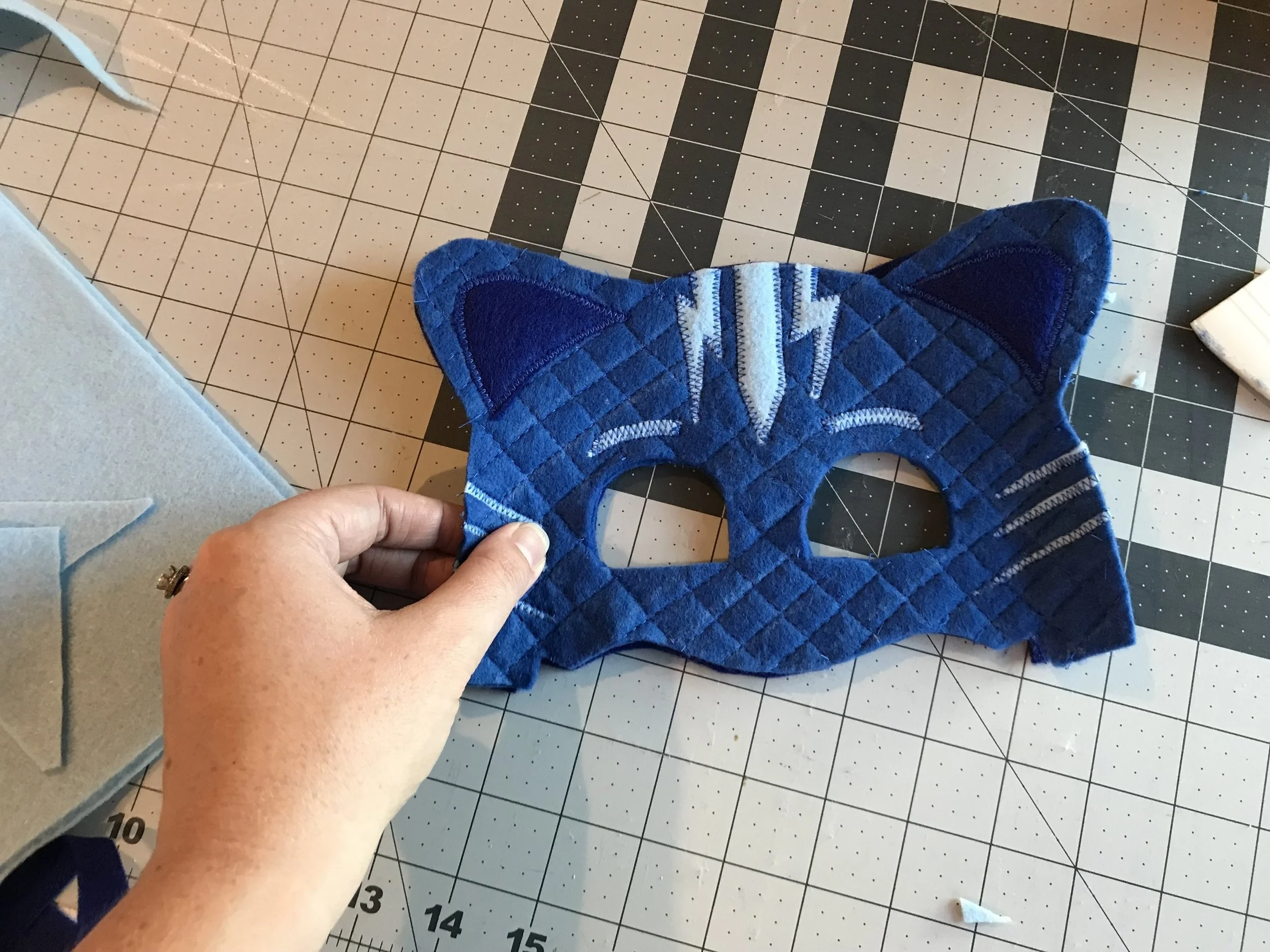 Now it's time to add all the details. Cut out the inner ears from dark blue felt and pin into place. Then zigzag stitch all the way around going thru your quilted layer mask.