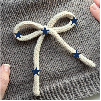 Using a tapestry needle and a small length of Color B yarn attach each bow where indicated for your size on the panels before seaming.