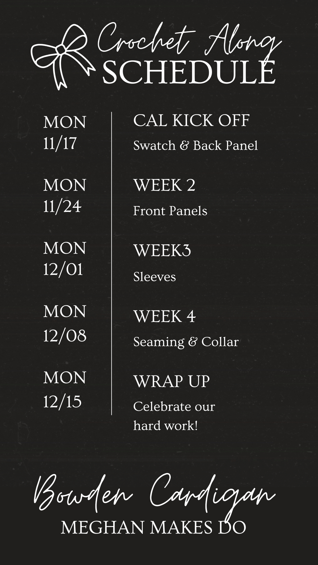 Every week, I’ll update the main CAL post with the new instructions and link directly to that week’s tutorial, so you’ll always know where to find everything. You can crochet at your own pace, share progress pics on Instagram using #BowdenCardiganCAL, and connect with other makers in the Meghan Makes Crew community.
