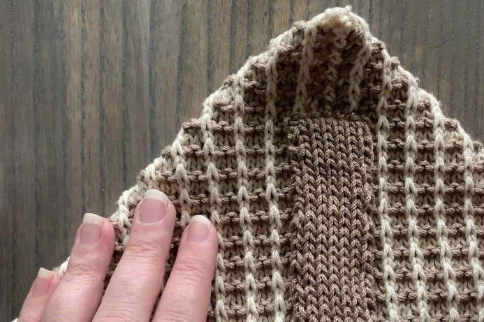 Keep scrolling to make the Carson knit version or head over to Rachel’s blog to make the Cade crochet version. Both are made using Lion Brand 24/7 cotton in Ecru and Taupe. It’s the perfect yarn for bags since it’s durable but still has a bit of stretch to it.