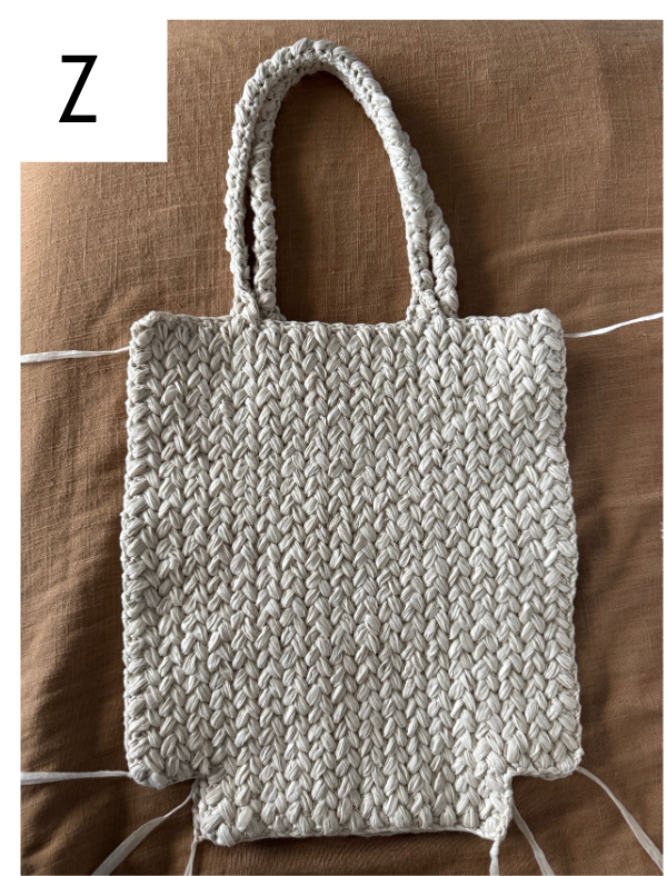 Place both panels together with RS facing each other. Then using the whip stitch, seam the sides and the bottom of the bag together. (fig. Z)